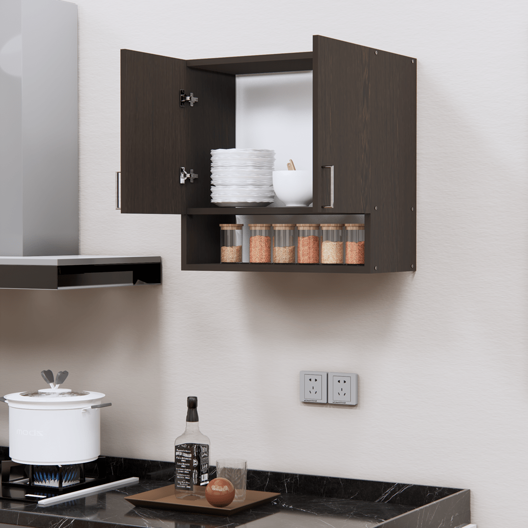 This Chiyoda Wenge Matte finish multipurpose storage Cabinet made from environment friendly European Standard Engineered wood. It can be used as a storage cabinet in a modular kitchen. 2 shelves & 2 doors with beautiful aluminum silver metal handle with Open Organizer Shelf can store infrequently used items to maintain your items clean and dry make your space organized and comfortable. Scientific design greatly improving space utilization. Pairing door with 2 shelves, A wall mount display ensures your storage box for kitchen remain within sight so cooking only gets easier! With it’s wider Compartment design this is the ultimate space saving kitchen organizer, you can store all of your spice containers for kitchen, masala box for kitchen, plastic oil cans, plastic boxes for storage, kitchen containers set, kitchen accessories for home, container for kitchen storage set, etc.