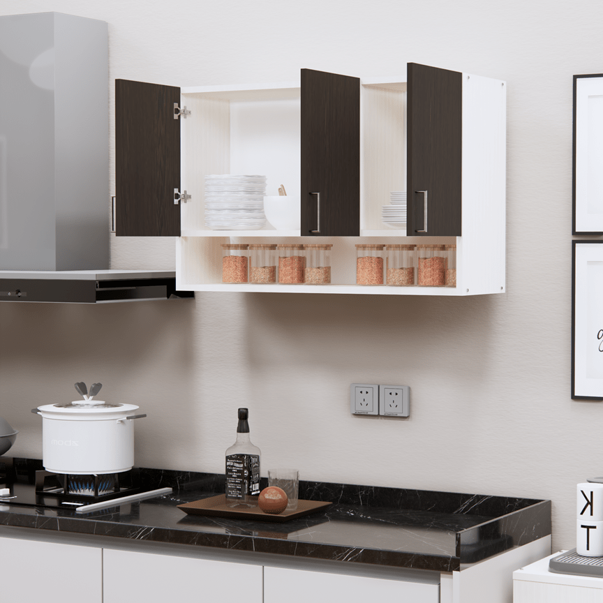 This Scarlet Red & Highland Pine Matte finish multipurpose storage Cabinet made from Engineered wood. Upgrade your kitchen with this elegant wall-mounted storage cabinet made from eco-friendly European Standard Engineered Wood. Featuring 3 doors, 3 shelves, and an open organizer, it’s perfect for storing spices, containers, and kitchen essentials. Stainless steel handles add a modern touch, while the smart design maximizes space and keeps your items clean, dry, and within easy reach. Ideal for modular kitchens.