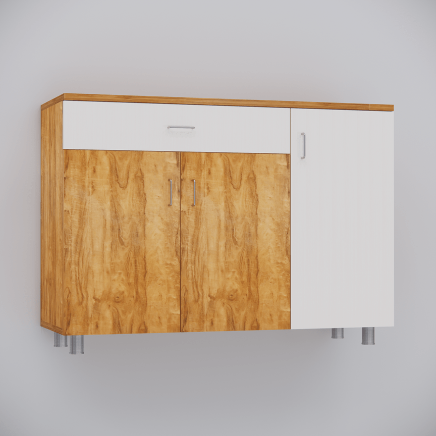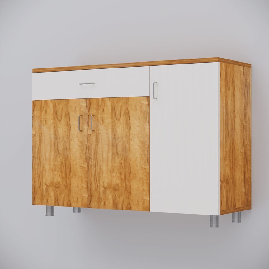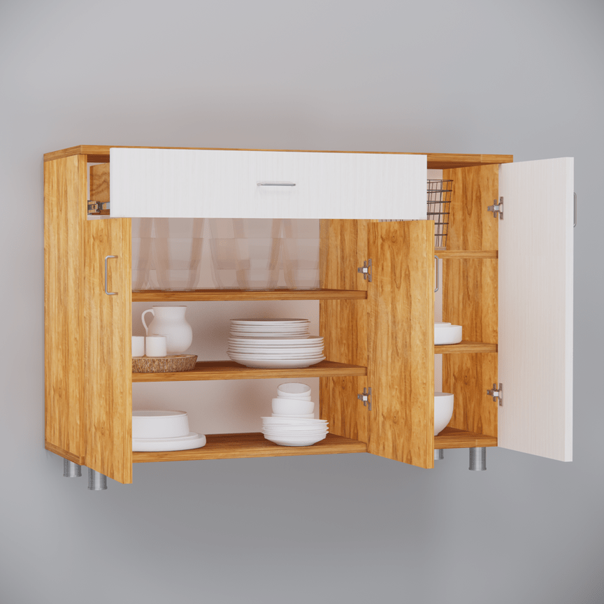 Transform your kitchen into a model of efficiency and style with this sleek 3-Door Plateau Apple & Highland Pine Finish Storage Cabinet. Crafted from durable engineered wood with a chic PU coating, this cabinet combines elegance and functionality. Its scientific design maximizes space, featuring 7 spacious shelves for all your kitchen essentials—from spice containers and masala boxes to oil cans and storage boxes. With its wide compartments, this cabinet is the ultimate space-saving organizer. Whether it’s your kitchen accessories or everyday necessities, everything has a place. Plus, the secure drawer offers privacy for your most personal items, keeping them clean, dry, and easily accessible. Get ready to elevate your kitchen storage and organization to new heights!