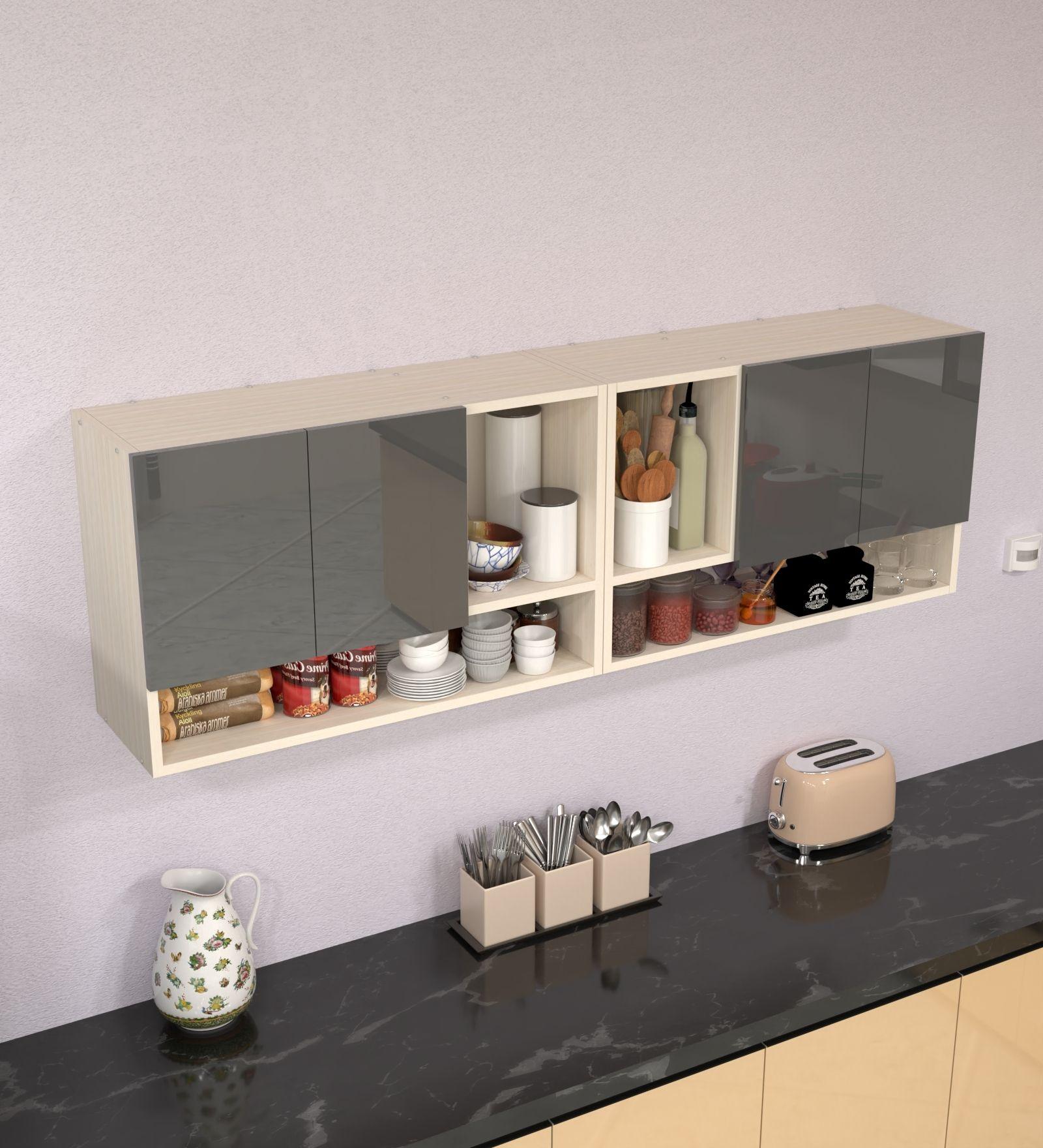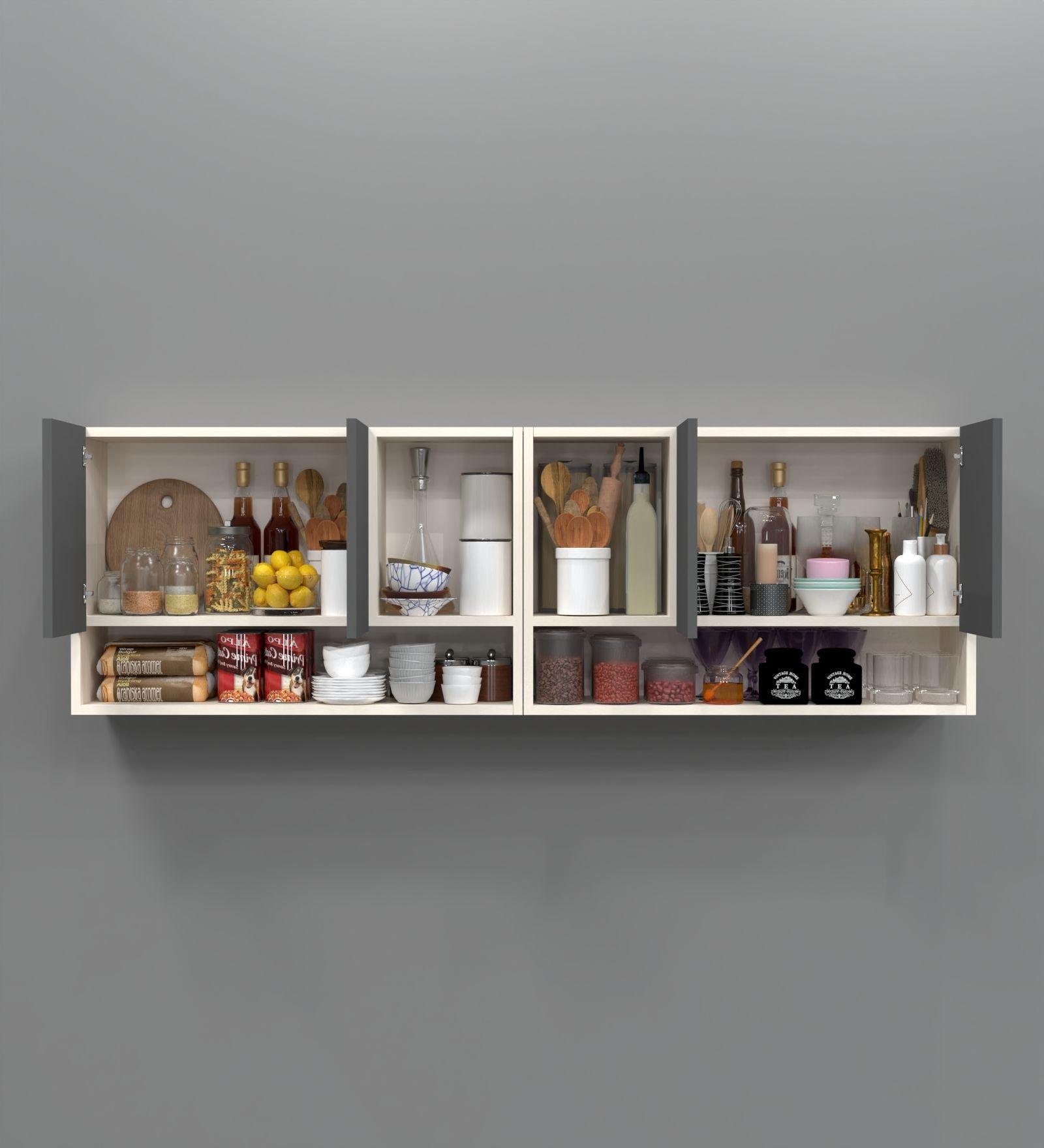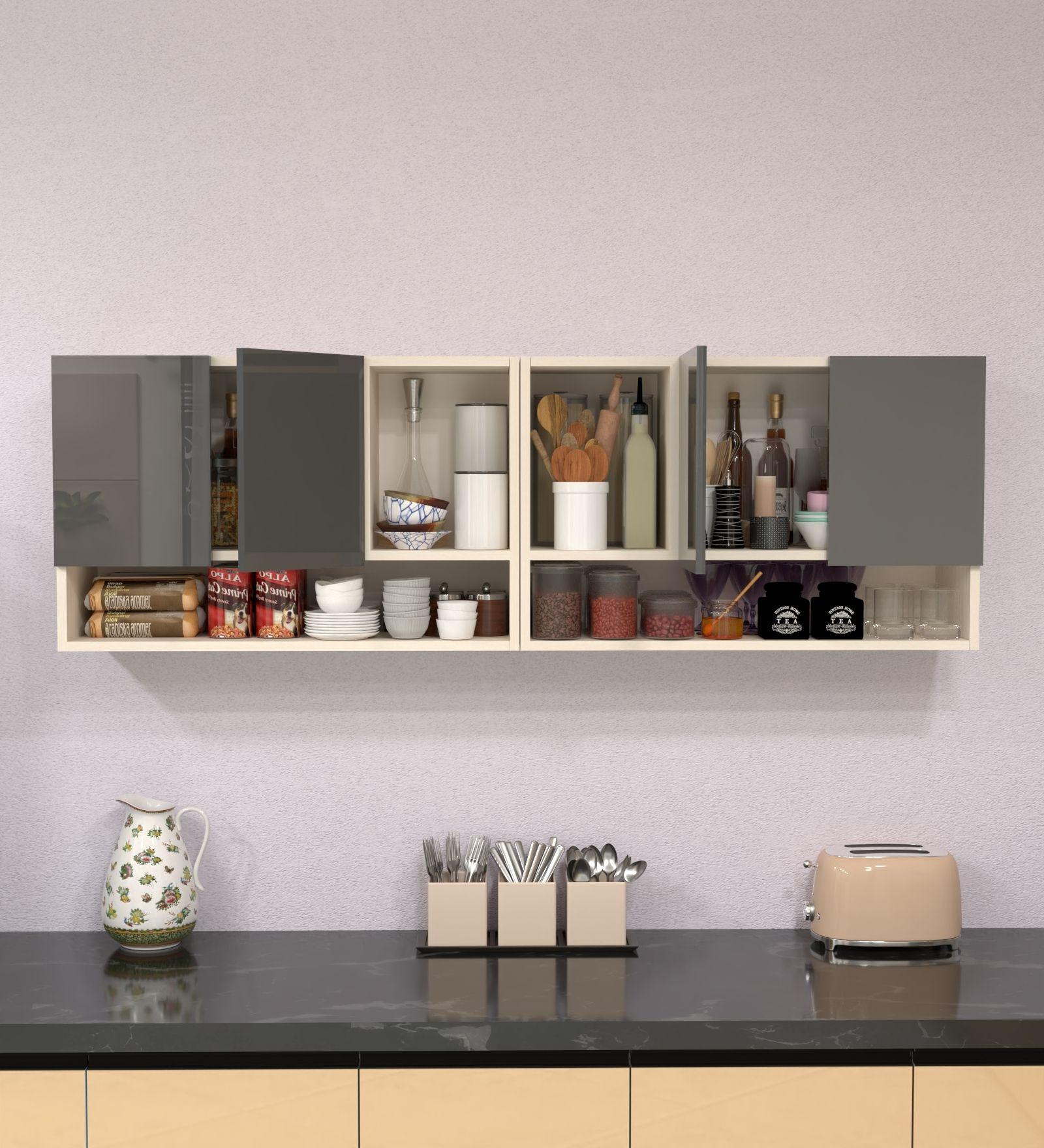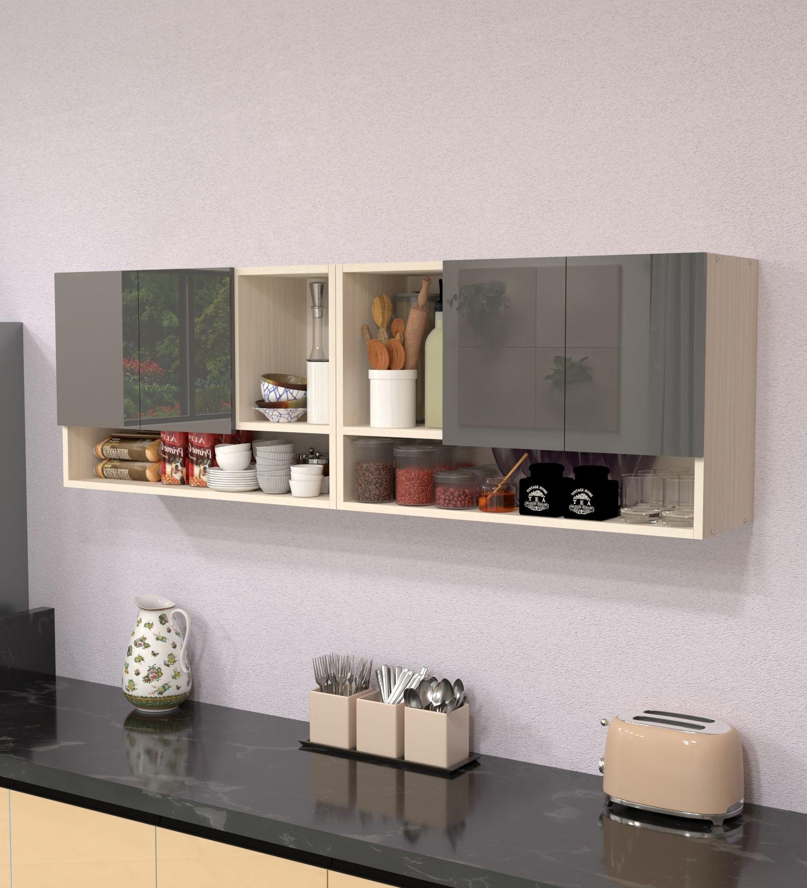 This Grey glossy UV coating finish multipurpose storage Cabinet made from environment friendly European Standard Engineered wood. A UV-coated wall-mounted storage cabinet combines durability, aesthetics, and protection for everyday use. It can be used as a storage cabinet in a modular kitchen. 6 shelves & 4 doors with handless shutters & Open Organizer Shelf can store infrequently used items to maintain your items clean and dry make your space organized and comfortable with French Cleat system distributes the weight of the furniture evenly, making it ideal for heavy pieces. Fixed Shelves to accommodate a variety of items like books, toiletries, or kitchenware. You can store all of your spice containers for kitchen, masala box for kitchen, plastic oil cans, plastic boxes for storage, kitchen containers set, kitchen accessories items for home, container for kitchen storage set, etc. For any product related query please call the Toll free number on the box to get proper solution.