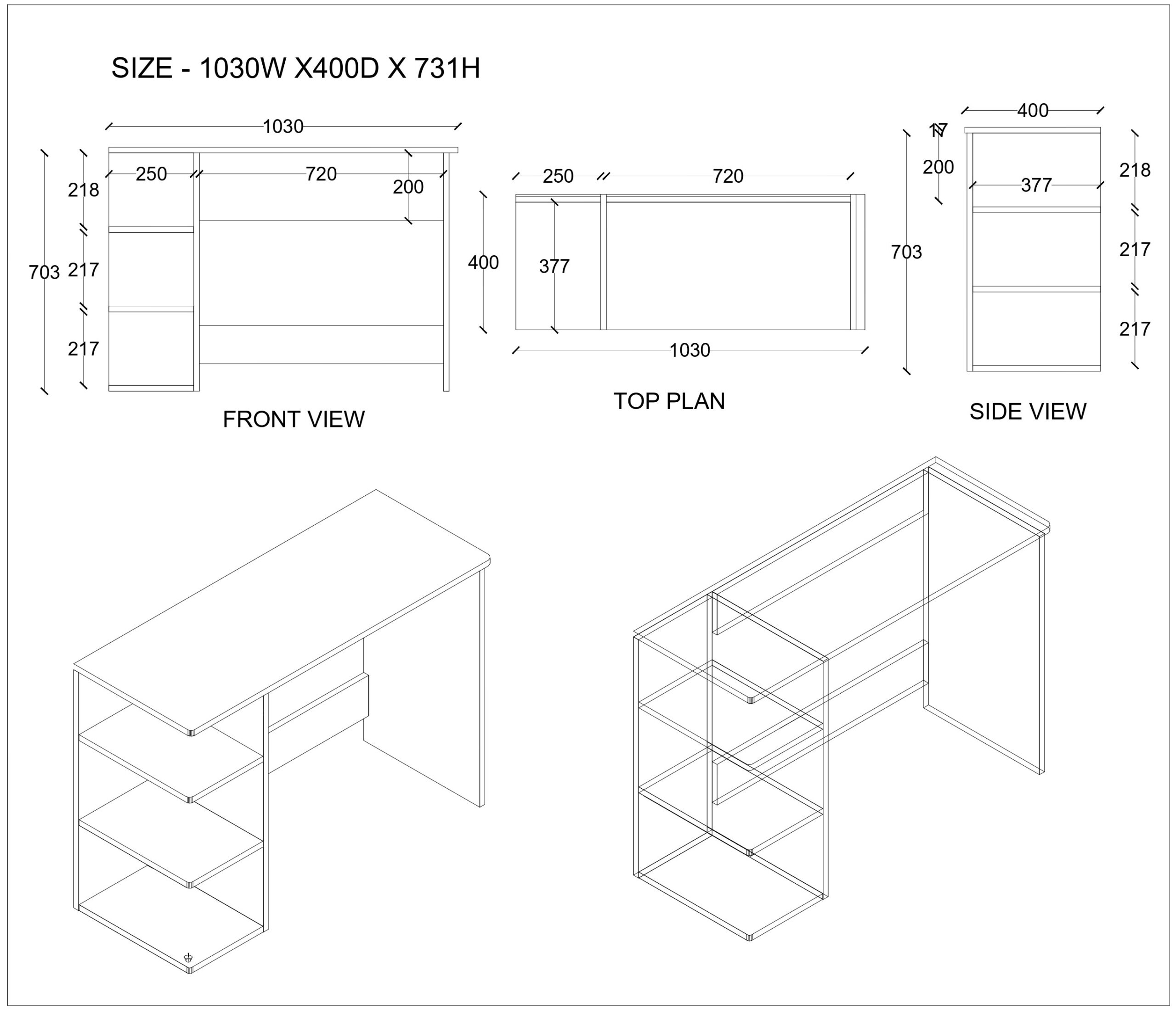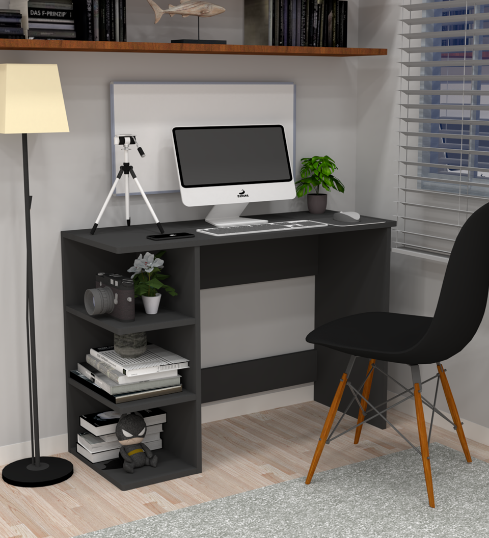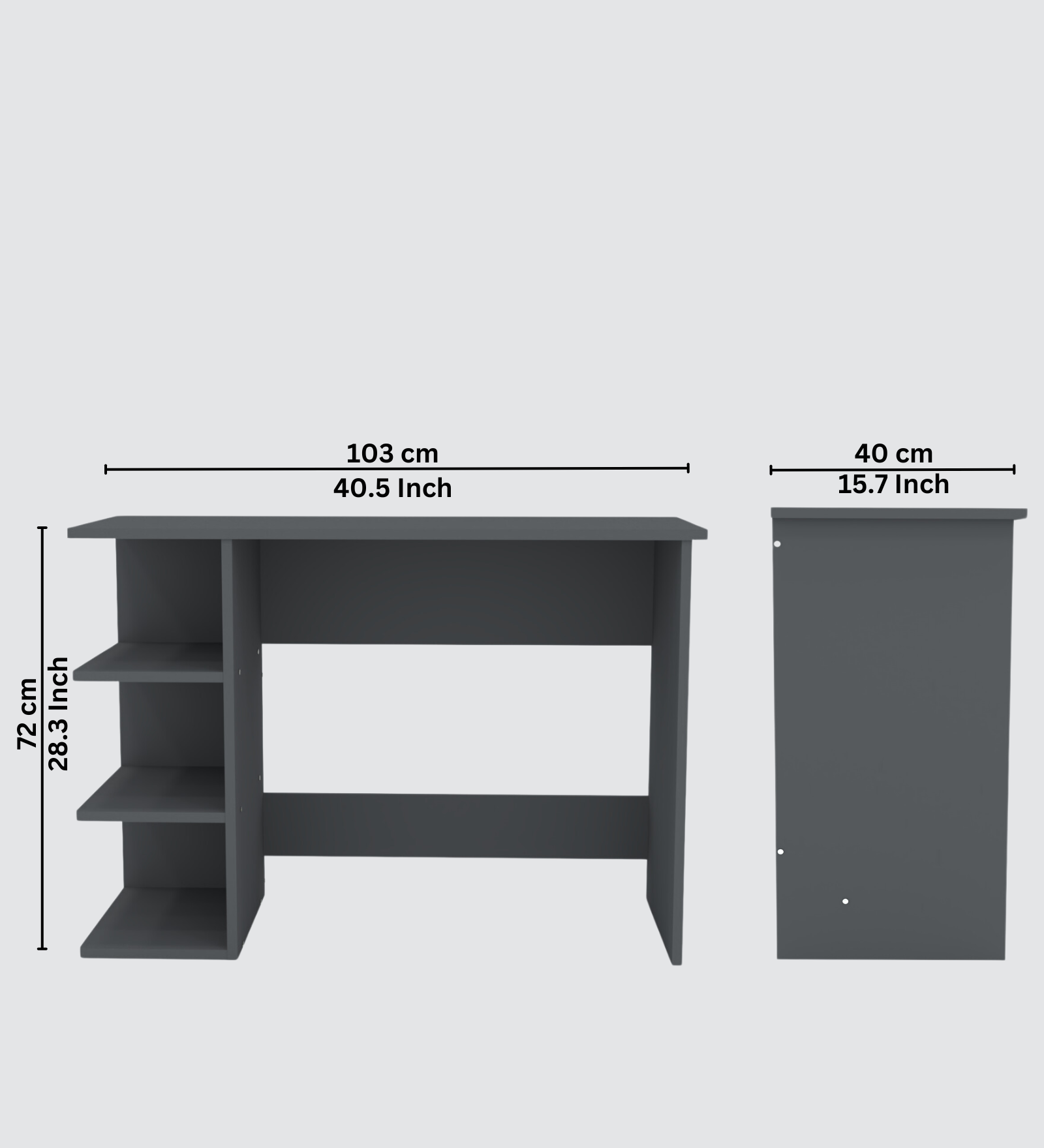 The Slate Grey finish made from high-quality engineered wood, ensuring long-lasting durability and stability for daily use. The desk’s surface is polished to a smooth finish, enhancing the desk’s overall look while making it easy to clean and maintain is the perfect choice & Termite and borer resistant naturally. The desk is constructed with 17mm thick Engineering wood panels, providing a robust and solid surface that can support heavy loads, ensuring your workspaces remains stable and secure. Top surface for studying, reading, writing, and other academic or professional activities. The spacious 3 Side open shelf is perfect for storing books, files, and decorative items, doubling as a convenient bookshelf to keep everything within reach. Transform your study area into a sophisticated retreat, where every detail reflects your taste for distinctive design & Elevate your workspace. For any product related query please call the Toll free number on the box to get proper solution.