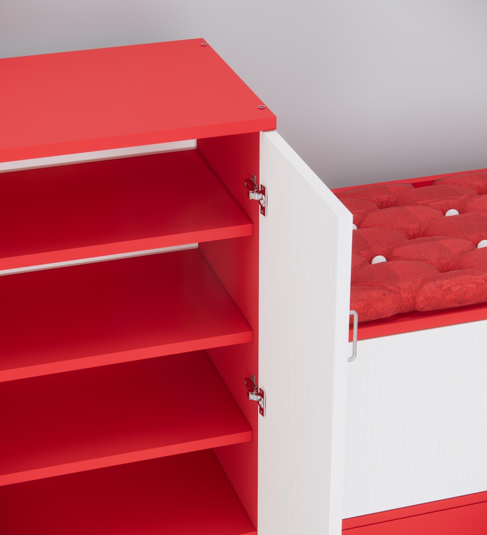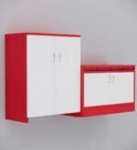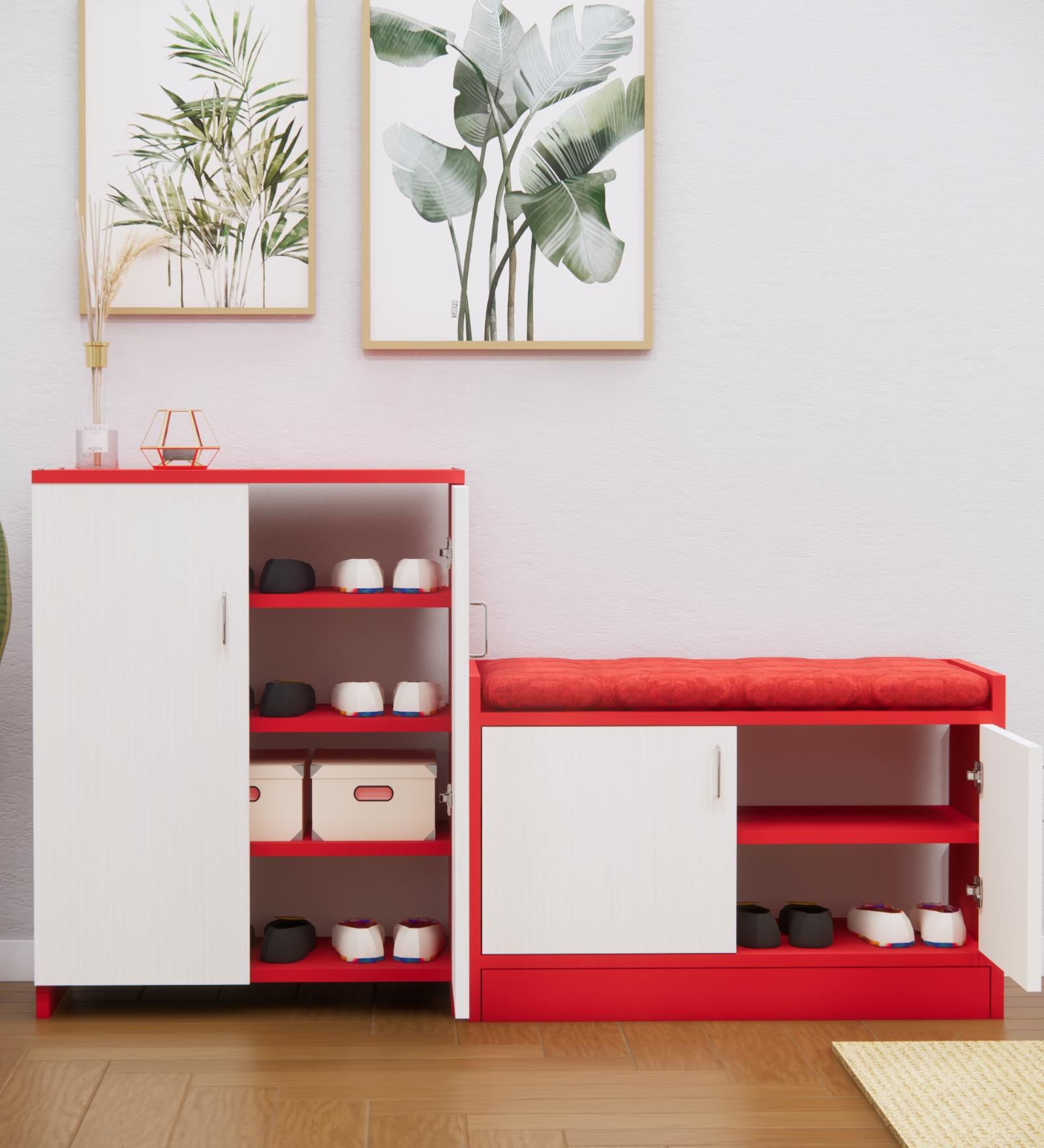 This multipurpose furniture combo includes a two-shelf cabinet and a four-shelf shoe rack made from eco-friendly European standard engineered wood with a rich Highland Pine & Scarlet Red  finish. Featuring stainless steel handles and a reversible cotton cushion with white-golden beads, it offers both ample storage and comfortable seating. Ideal for organizing shoes, accessories, and everyday items, it combines functionality with elegant design while maximizing space.