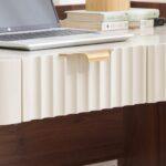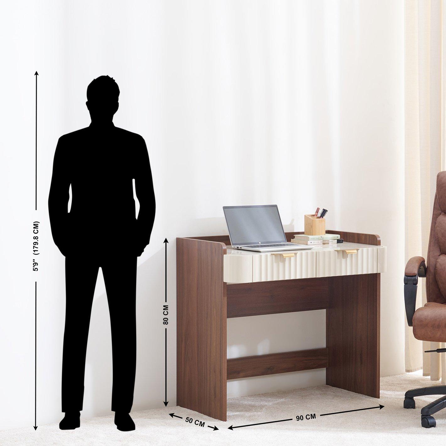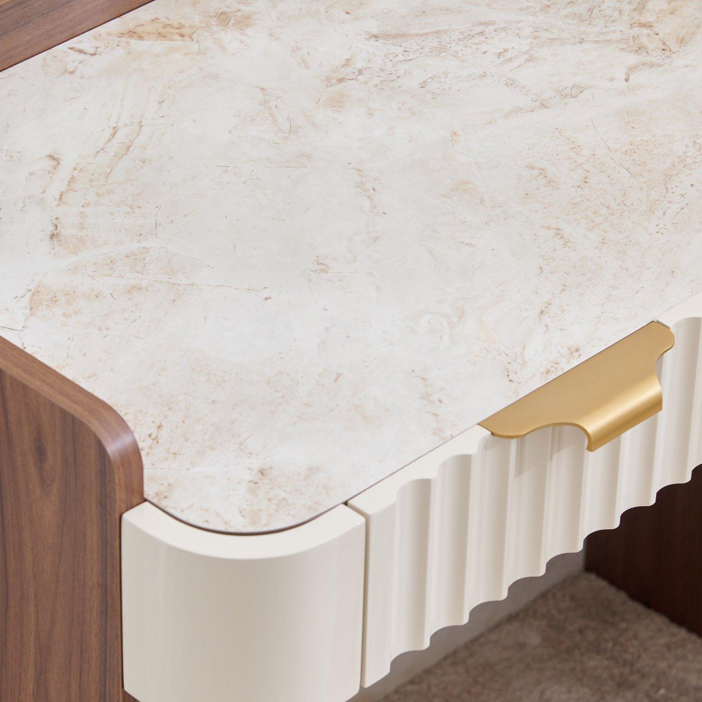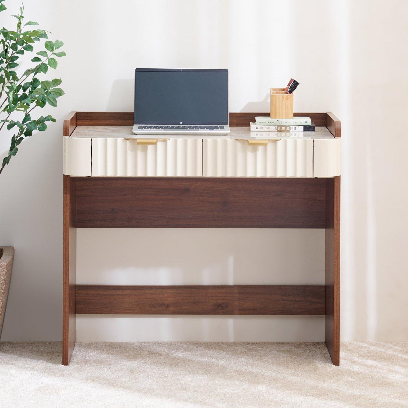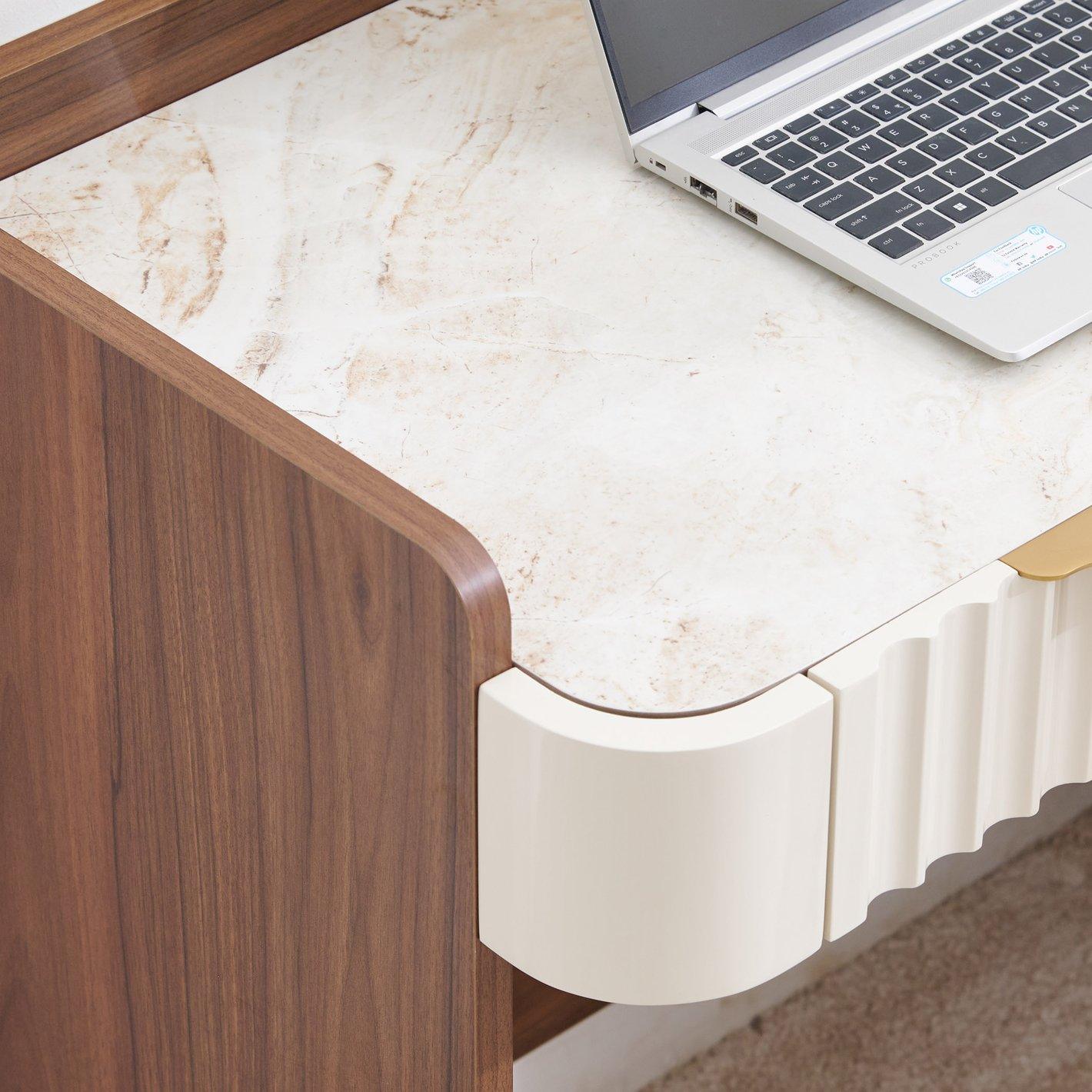 The desk features a stunning marble-finish top that provides a cool, durable surface for intensive work sessions. This is beautifully contrasted by a deep walnut-finish frame and the striking ivory fluted drawer fronts, creating a professional multi-tonal look that complements luxury interiors.