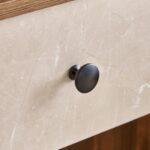 Every detail of this desk exalts quality. The $95 \text{ cm}$ wide surface features rounded, ergonomic edges and a durable finish that resists the rigors of daily use. The design is accented by custom knurled brass hardware, providing a luxury touch-point every time you access your supplies.