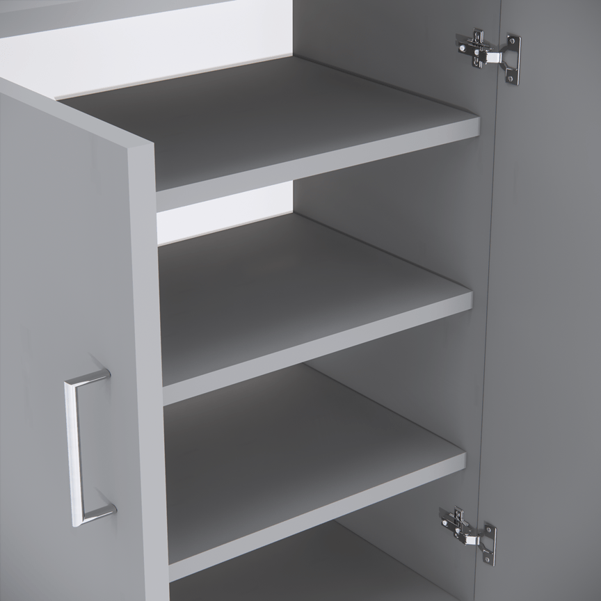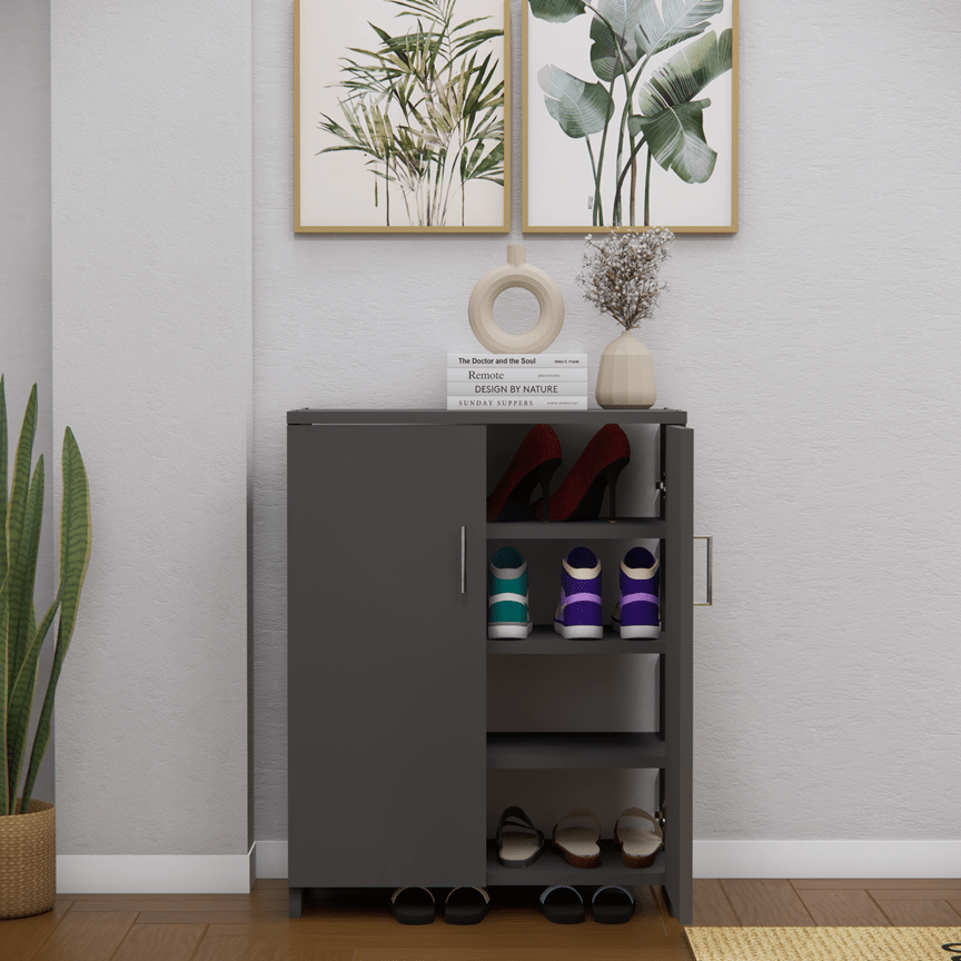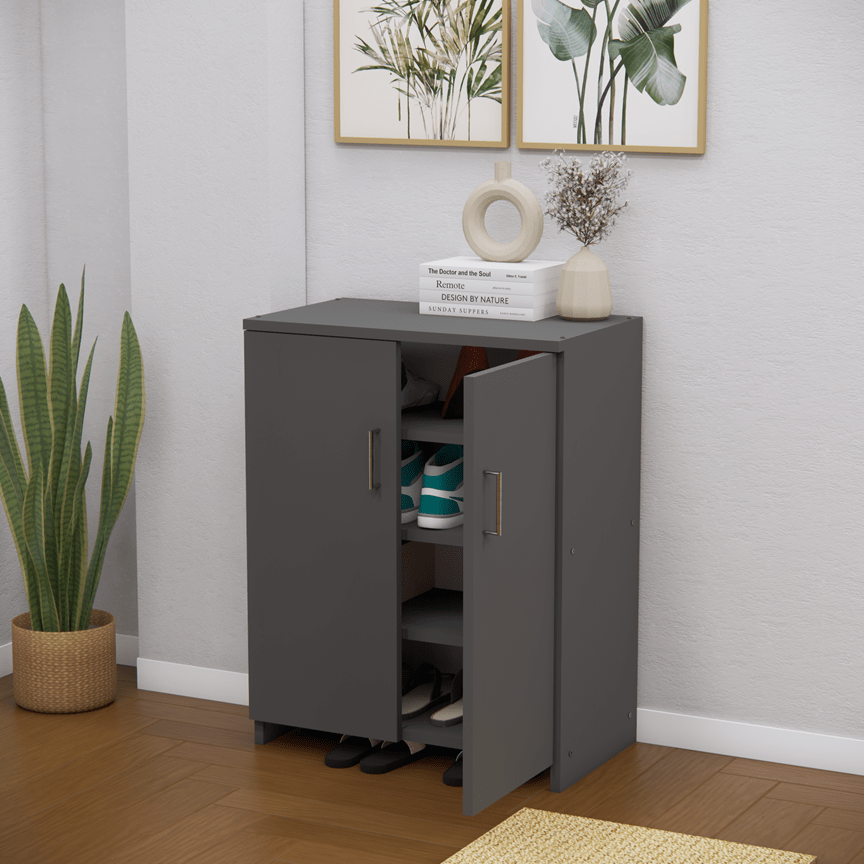 Upgrade your space with this elegant 2-door shoe cabinet in a Slated Grey finish. Featuring 4 spacious shelves, sturdy construction, and sleek stainless steel handles, it’s perfect for storing shoes, slippers, socks, and more. Storage cabinets are perfect for keeping your space tidy and organized. They offer a dedicated place for your essentials, making it easy to store, access, and manage items efficiently. A durable and classy addition to any room—easy DIY assembly included!