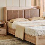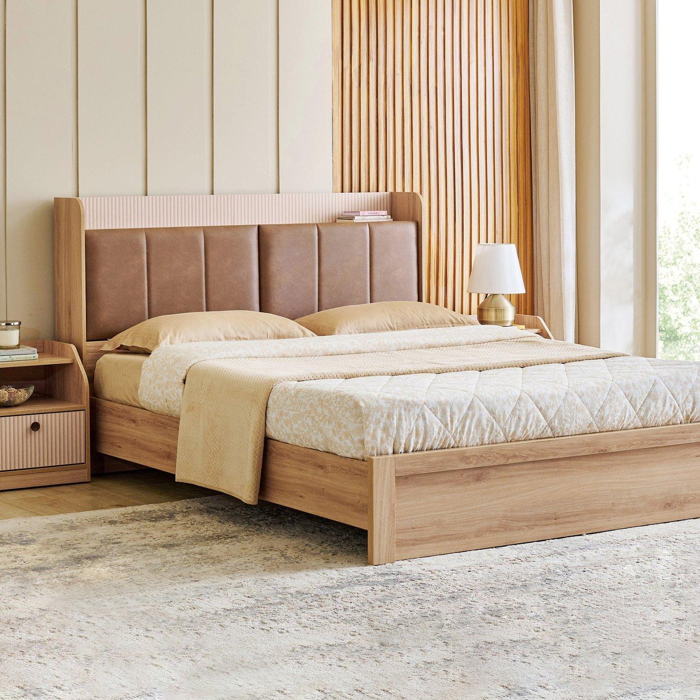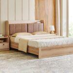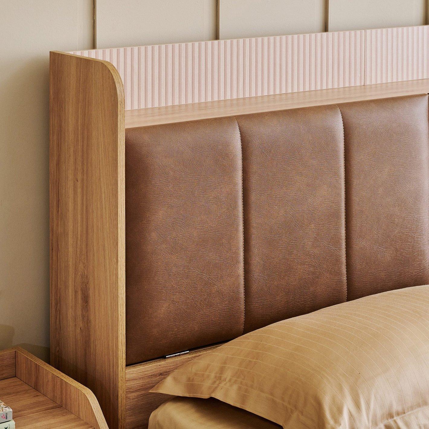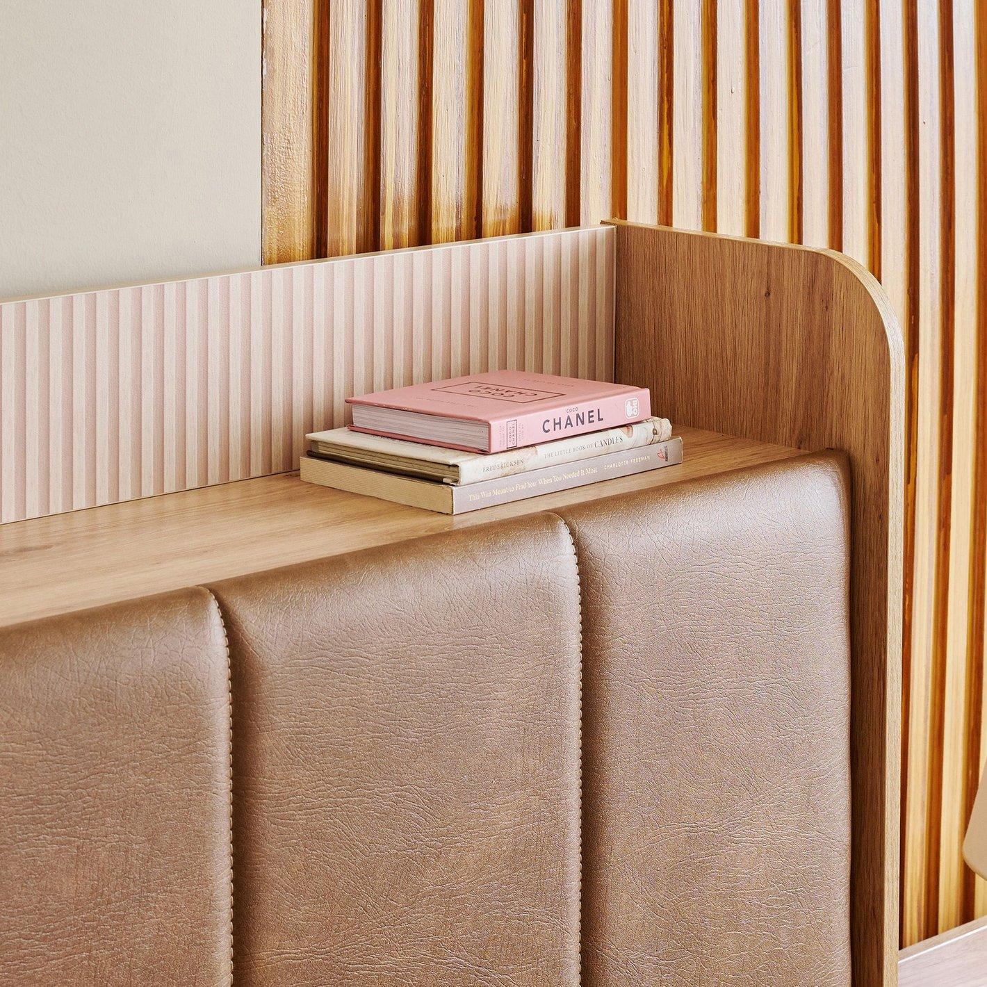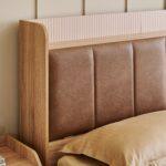 Luxury Comfort & Sophisticated Design The Oak & Tan Queen Bed is designed to bring a high-end, boutique hotel feel to your home. The centerpiece is the tall, ergonomically padded headboard, featuring vertical segmented stitching in high-quality vegan leather. This provides a soft, comfortable backrest for reading or watching television while adding a rich, textural contrast to the clean wood-grain frame.