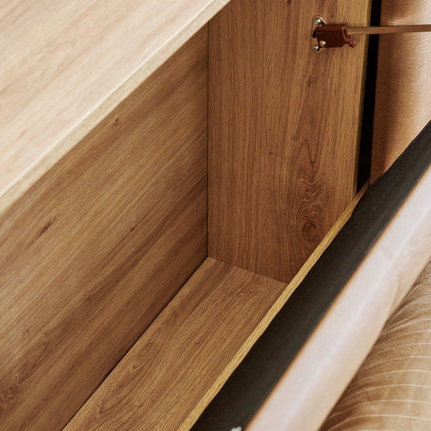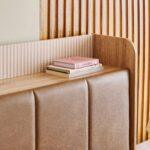 Headboard Detail: Padded with high-resilience foam and finished in durable, easy-to-clean tan vegan leather.