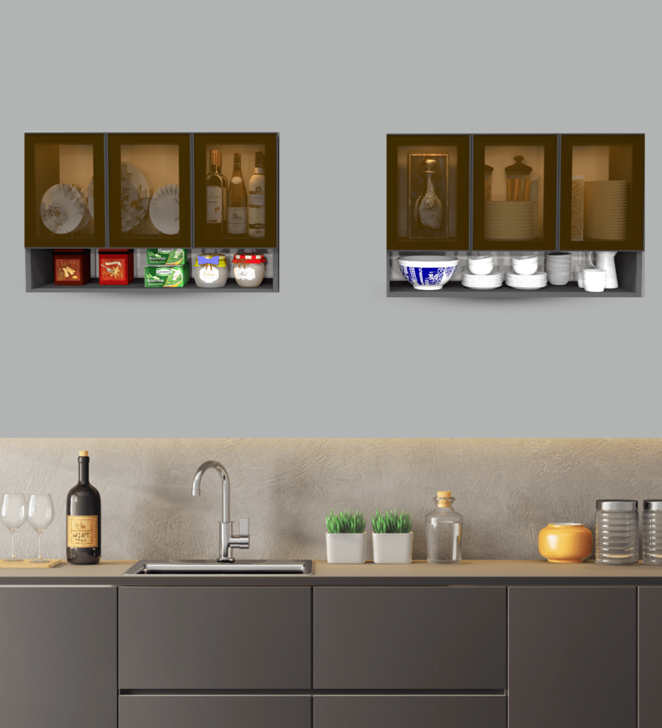 Cabinet offer a sophisticated and modern solution for combining sleek aesthetics with functionality. These shutters feature a contemporary design, a black aluminium frame, 4 Fluted Plain Natural Partial Transparent Glass with 6 shelfs, handle less mechanism, providing a smooth, minimalist look. You can also divide this cabinet in half-half as per your convenience and install two at a distance with French cleat use brackets are often hidden from view, creating a clean and minimalist look You’ll find ample storage space to neatly organize. Cabinet constructed high-quality engineered wood materials, the cabinet features a sturdy frame that ensures durability and stability. You’ll find ample storage space to neatly organize. A wall mount display ensures your storage box for kitchen remain within sight so cooking only gets easier! this is the ultimate space saving kitchen organizer, store all of spice containers for kitchen, masala box etc.