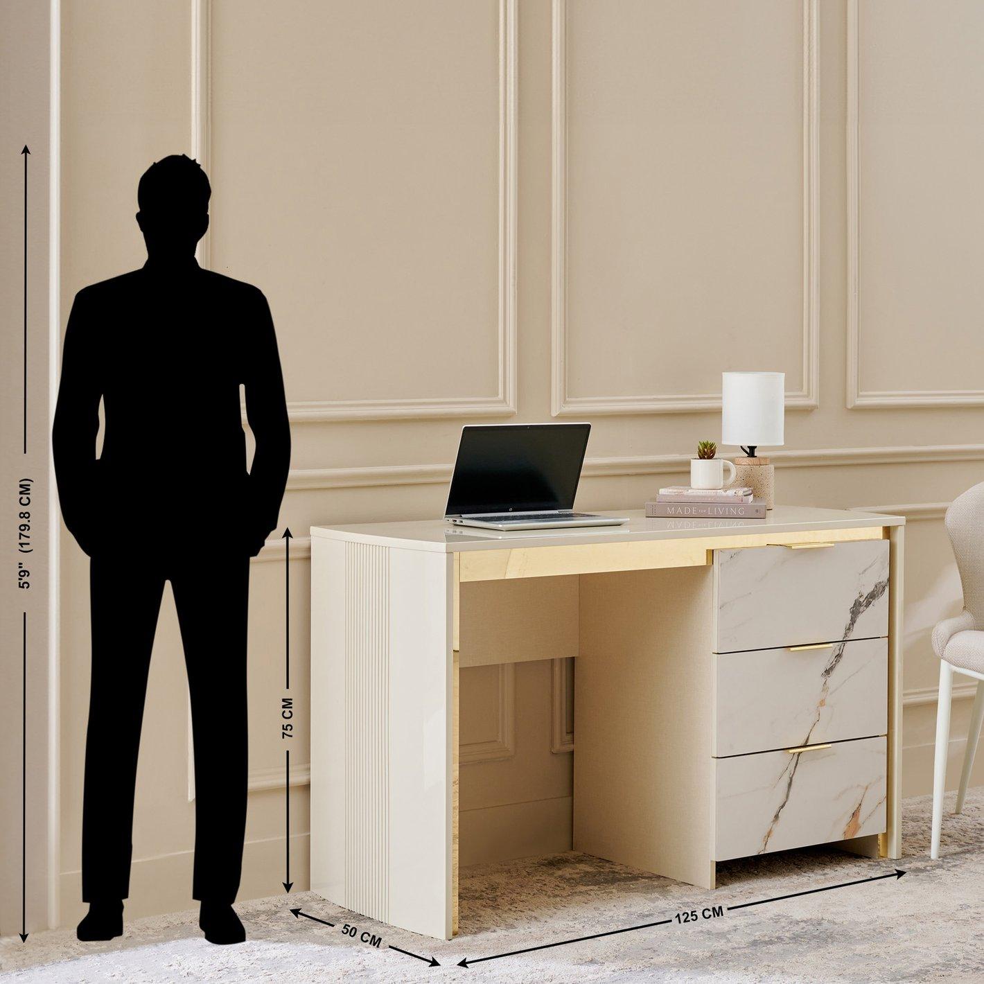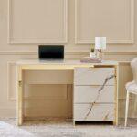 Exquisite Material Composition The desk’s frontage is defined by three vertically stacked drawers featuring a realistic marble-grain laminate, each meticulously finished to provide a seamless visual flow. This is complemented by a bold gold-finished structural beam that adds lateral strength while serving as a signature design element.