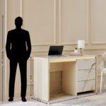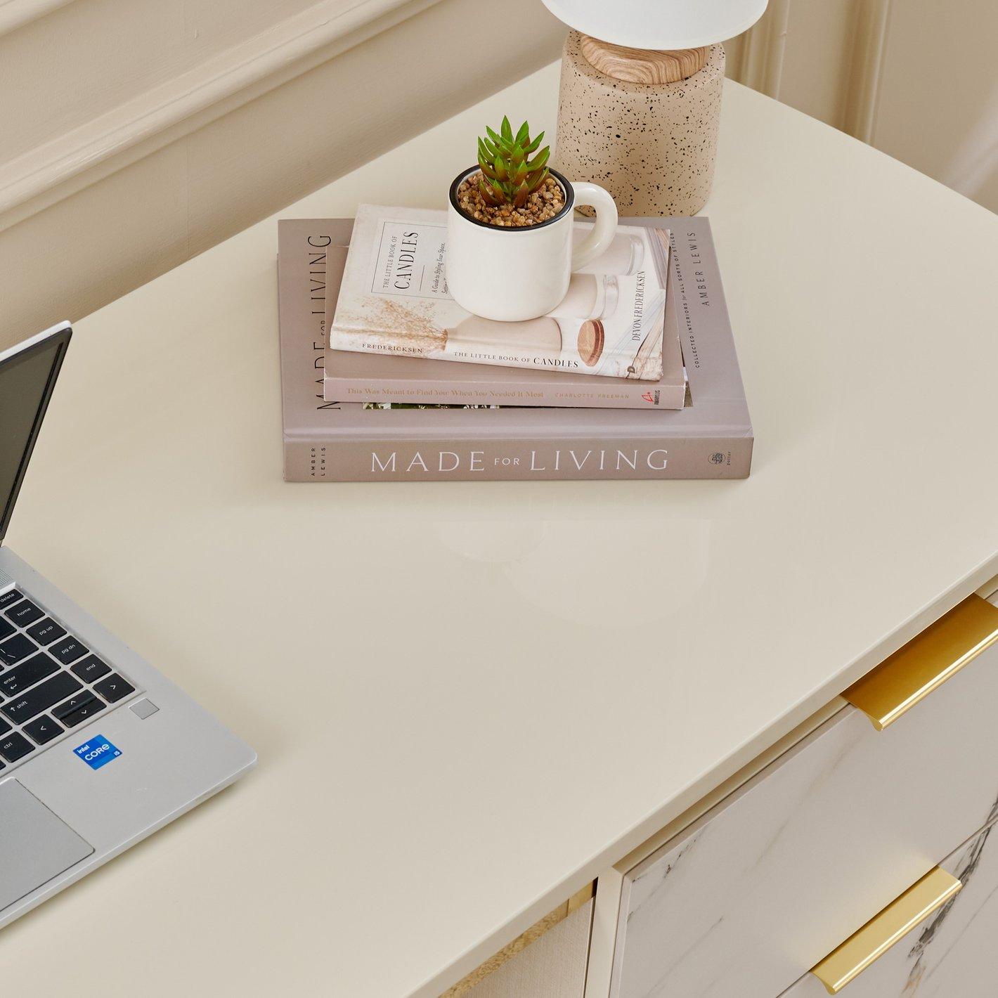 Designer Handles: Low-profile gold-toned metallic pulls offer an ergonomic grip while maintaining the desk’s sleek, modern silhouette.