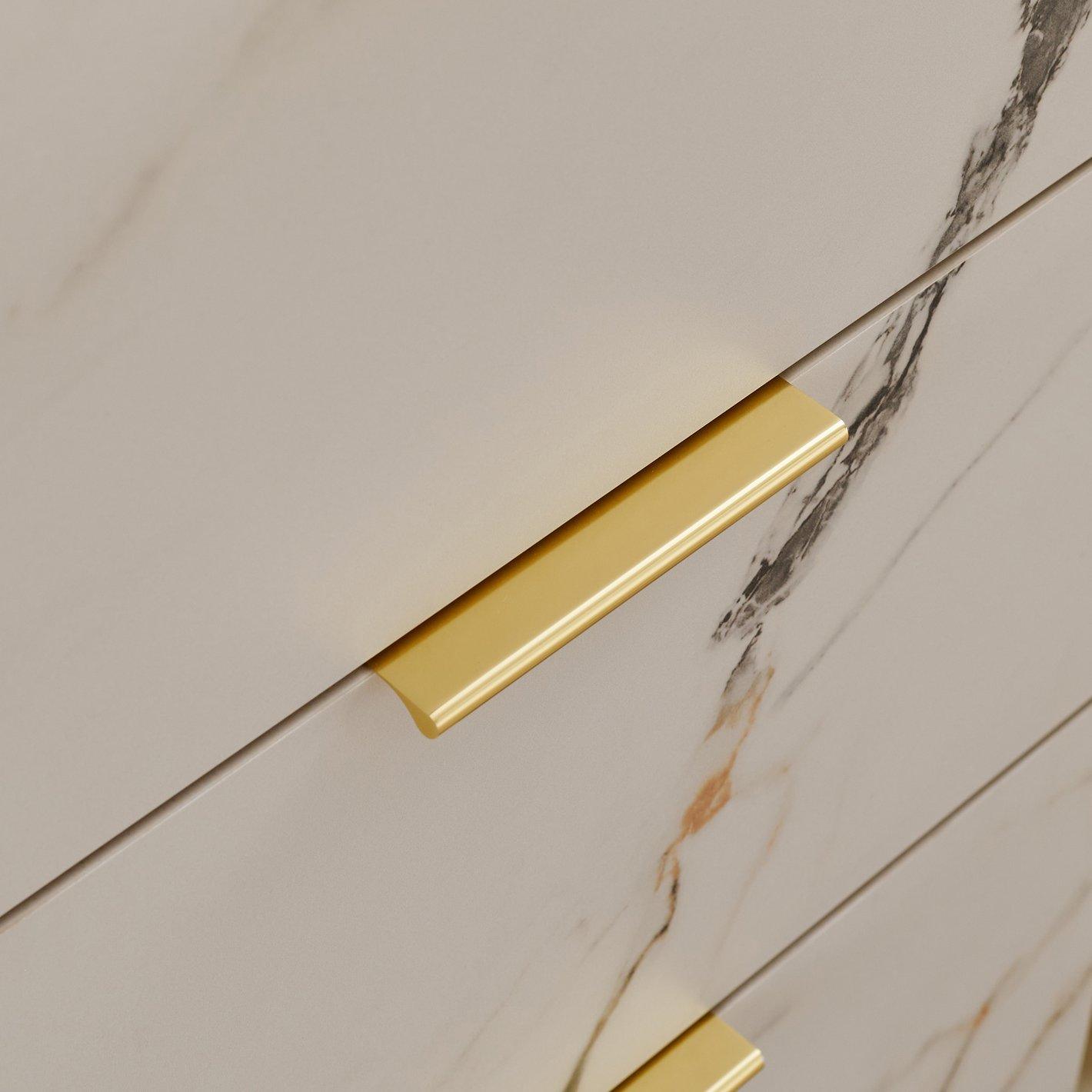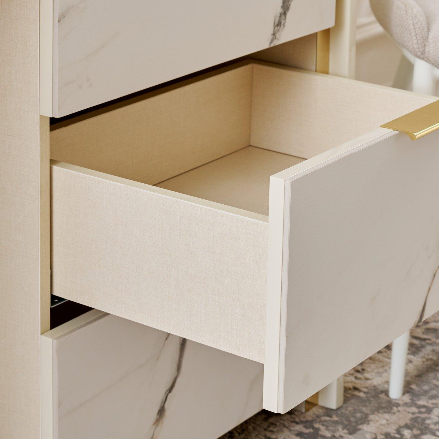 Surface Finish: High-gloss Ivory with Marble-patterned drawer faces.